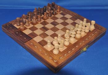 Chess has been hailed as the greatest of games, being a challenge for all level of players. It was included in numerous Hoyle's Rules of Games as well as boys' activities books.This set has a border of wood on the bottom that, when the board is folded, forms a closed cavity that can be used to store the pieces. It is very similar to one on display in the Visitors' Center in Gettysburg. The biggest difference is that the original has the hinge on the other side so that the cavity is on the same side as the board. However, we haven't found anyone making a duplicate of that board.The board is 8 inches long by 4 inches wide and 1 1/2 inches thick when closed and opens into a square 8 inches on a side