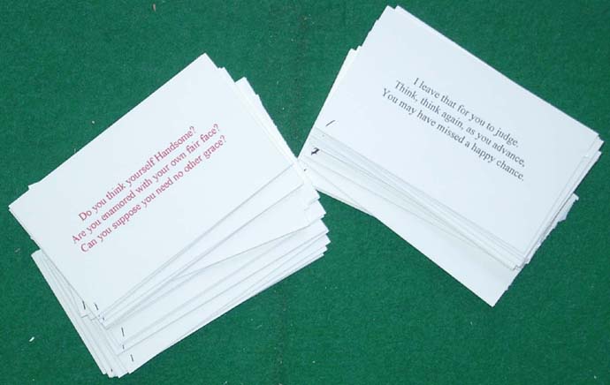 The concept of conversation cards -- a gentleman asks a question printed on a card and a lady provides an answer from a second set of cards -- had been in use from the early nineteenth century through the time of the civil war. This set is a reproduction in the exact words and approximate size of conversation cards from the 1850's in the collection of the American Antiquarian Society, located in Worcester, MA (reproduced with permission). An interesting element is that, unlike the later "Question and Answer" with simple single sentence statements, the questions and answers are phrased as a series of statements, e.g., for the gentlemen, each card has three related questions which are asked as one, and at least two of the three lines rhyme and sometimes all three. The set has 25 each of questions and answers. In lieu of using different colors of