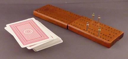 A card game played during the nineteenth century by two or four people at a time. The board was used as a means to count points, thus changing the rather mundane activity of keeping score to a more exciting race.The board that we carry is hinged so it may be transported easily. Folded, it is 3 3/4 inches long, just a scootch less than two inches wide, and 3/4 inch thick. When unfolded as it would be for playing, it would be twice as long but only half as thick. As was mentioned in the listing, it comes with a set of cards but those cards are modern coated cards. If being used for a nineteenth century impression, you may wish to purchase Playing Cards to use with the board. There is one other modification that would need to be made to make it more accurate for a historical scenario. The underside has a small compartment where the pegs can be stored when not in use. However, the sliding cover is plastic. If you want to make a wooden cover, a craft stick from a hobby store or a tongue depressor could be shaped to replace the plastic cover. The set also comes with instructions (they claim that the game can be played with 3 people but I don't