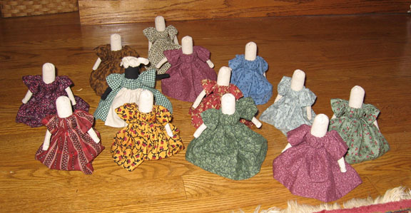 The picture shows a group of rolled fabric dolls which are typical of the finished rolled fabric dolls. They are each about 4 1/2 inches tall. So now, even if you feel challenged by the task of making your own doll from a kit, you can enjoy having a rolled fabric doll of your own. Because the dresses were made with scraps, we can't guarantee that we will have any of these dress patterns in stock at any given time. However, if you'd like to express a first, second, third, or more preferences for colors, we'll do our best to match your request. But, if we don't have your preference in stock, we will choose a doll at random. Be sure and read a bit about the history of these dolls on the previous page about the Rolled Fabric Doll Kit. And be sure and name your doll. We have not pre-named them because you may have some special name to give them. Also, note that one of the dolls is made with black material. For more about her, go to the next page, which is devoted to the Black Rolled Fabric Doll. Each of these finished dolls (with the exception of the black doll) is $13.50. See the next page down for the black doll. If you want to look at the previous doll in the list,.