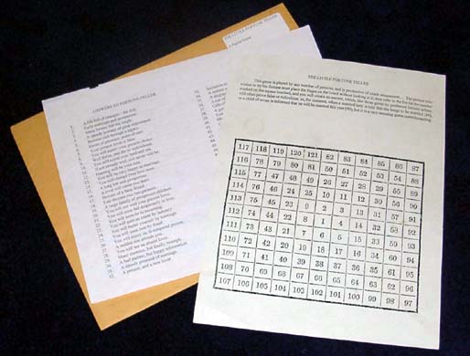 To play the game is simplicity itself. You close your eyes and stab your finger (gently!) on the grid. You then open your eyes and look what number is under your finger. Then you consult the listing of fortunes to find the one corresponding with that number. NOTE: If playing this game with children, you may want to examine each fortune to determine whether