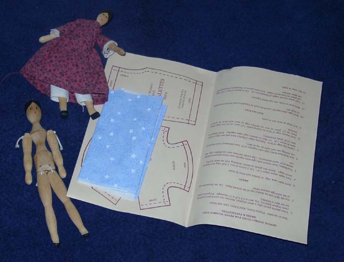 This latter kit comes complete with doll, fabric, and patterns. You add needle, thread, and time.