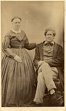 This image was prepared by R. R. Morgenweck in the summer of 1999 at the 136th anniversary of the Battle of Gettysburg. The photographer uses the same equipment and techniques of the civil war era photographers. To explain our expressions, their are different ideas about why the people looked so serious. One theory is that the chemicals used in the photographic process were much slower acting than today's dry films. Consequently, if the picture had been taken indoors, subjects might have had to hold their pose for 1 to 2 minutes. For such long exposures, photographers even employed iron frames to clamp on to the back of the subject's head to help hold them steady. For long exposures, you also cannot hold a smile without your face muscles twitching. Therefore, photographers may have had their subjects assume a blank or seemingly stern expression -- which they could hold for a period of time. We were lucky. Our image was taken in full sunlight and we only had to hold the pose for ten seconds. Another thought about the stern expressions is that getting your picture taken was an infrequent occurrence so it was a lot more serious moment. After all, you don't want to waste the expense of recording your image just to look like a grinning clown! If you look at the painted portraits of the civil war time as well as earlier periods, very few of those subjects were smiling. Or maybe the people were just taking their cues from the painted portraits. Since those people hadn't appeared to smile, they may have seen no need to smile either. Regardless of facial expression, another feature of the period photographic methods is their treatment of color. This subject is fully discussed in the article Virginia prepared for the February/March 1997 issue of Citizen's Companion. Summarizing rather simply, reds, oranges, and yellows usually photographed black. Light blues photographed white. The result was a lot of the people in period photographs look like they are ready for a funeral -- especially when coupled with their expressions discussed above. With the above information in mind, look at how our clothing colors were captured. Virginia's dress is wine red with black and white decorative elements. In the image, the wine and black blended together and only the white of the decorative elements appears. The most striking elements of Michael's attire are his cravat and vest. Where his bright gold cravat was horizontal, it photographed black. Where it was vertical, it photographed grey. His mustard and maroon plaid vest looks like it is vertical stripes. |