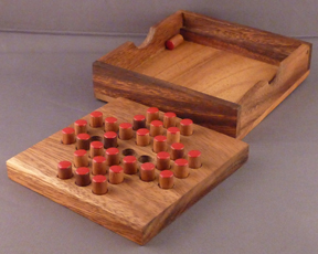 To play the game, you remove the peg in the center. Then, you jump one peg over another and remove the peg jumped over. Play continues until no further jumps are possible. The ideal end to the game is to have only one peg remaining and that peg in the center hole. The version of the game we carry is a square wooden block about four inches on a side and with a wooden top that fits over it. The top of the pegs are painted. To assist in keeping track of the pegs, they may be placed in the upside down top as play progresses. The cost of a Solitaire is $8.25