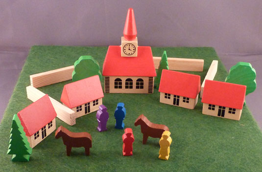 The other set on the left (labelled Village II in the price list) includes a town hall (counting the spire on the hall, about 3 1/2 inches tall), four houses each about 1 1/2 inches long, four pieces of wall each about 2 3/4 inches long, two bushy deciduous trees, two conifers, two horses, and four people. Like the other village, the people are especially tiny, each being slender and only an inch high. And we're sorry but the villages do not include the green felt "grass" for the village. That is