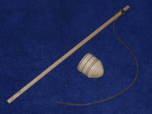 The top is first spun between the hands to get it started. Then, the top is flailed with the leather thong on the whip. Because of the presence of the leather thong, we recommend that